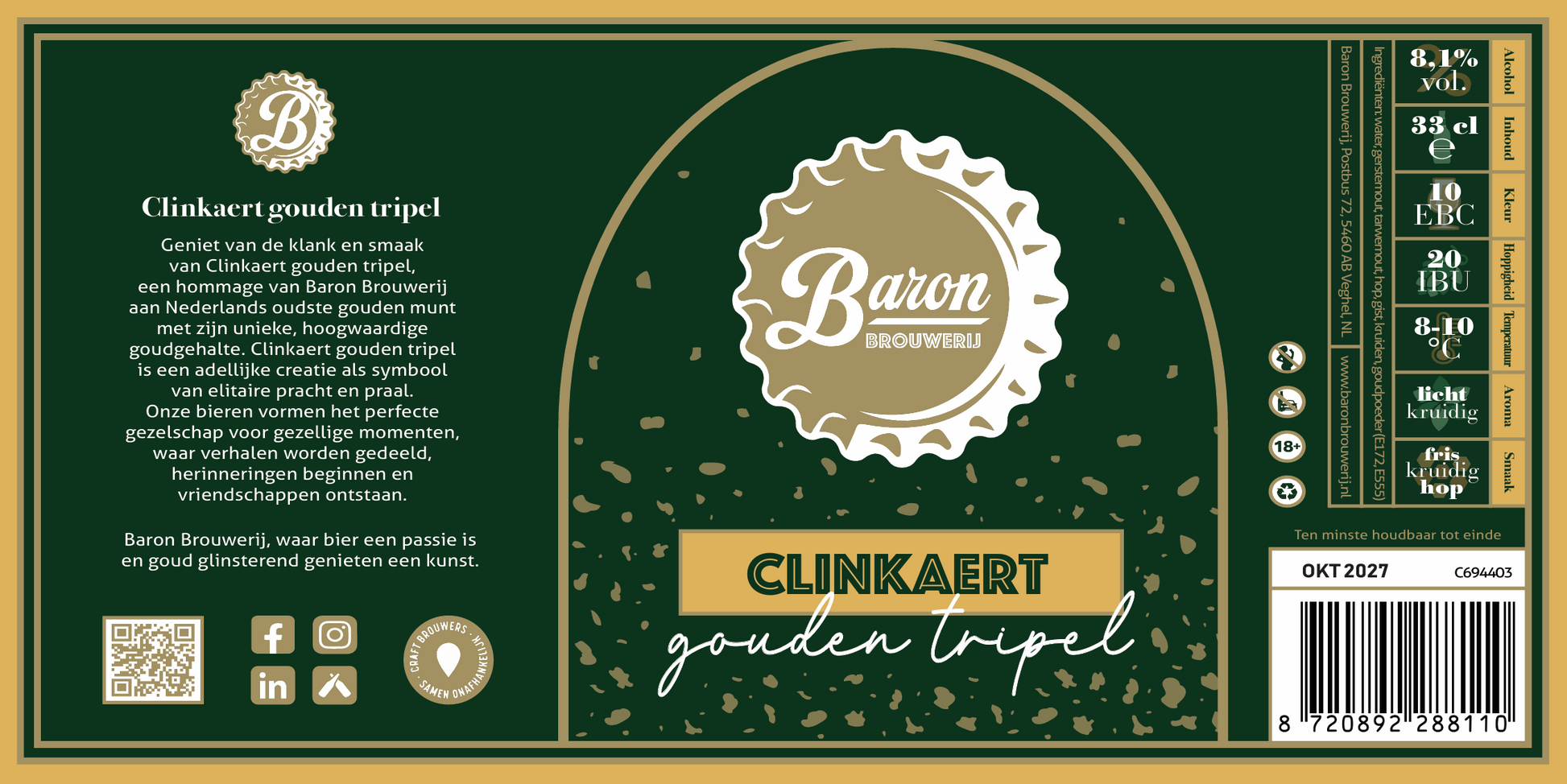 Geniet van de klank en smaak van Clinkaert gouden tripel, een hommage van Baron Brouwerij aan Nederlands oudste gouden munt met zijn unieke, hoogwaardige goudgehalte. De Clinkaert stamt uit de 14e en 15e eeuw en de kwaliteit van deze gouden munt was te herkennen aan de onmiskenbare klank.