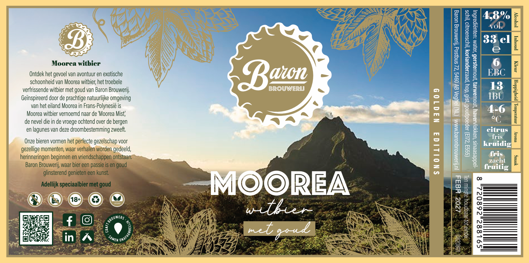 Ontdek het gevoel van avontuur en exotische schoonheid van Moorea witbier, het verfrissende witbier van Baron Brouwerij. Geïnspireerd door de prachtige natuurlijke omgeving van het eiland Moorea, een van de Society-eilanden van Frans-Polynesië, heeft Baron Brouwerij Moorea witbier vernoemd naar de ‘Moorea Mist’, de nevel die in de vroege ochtend over de bergen en lagunes van deze droombestemming zweeft.